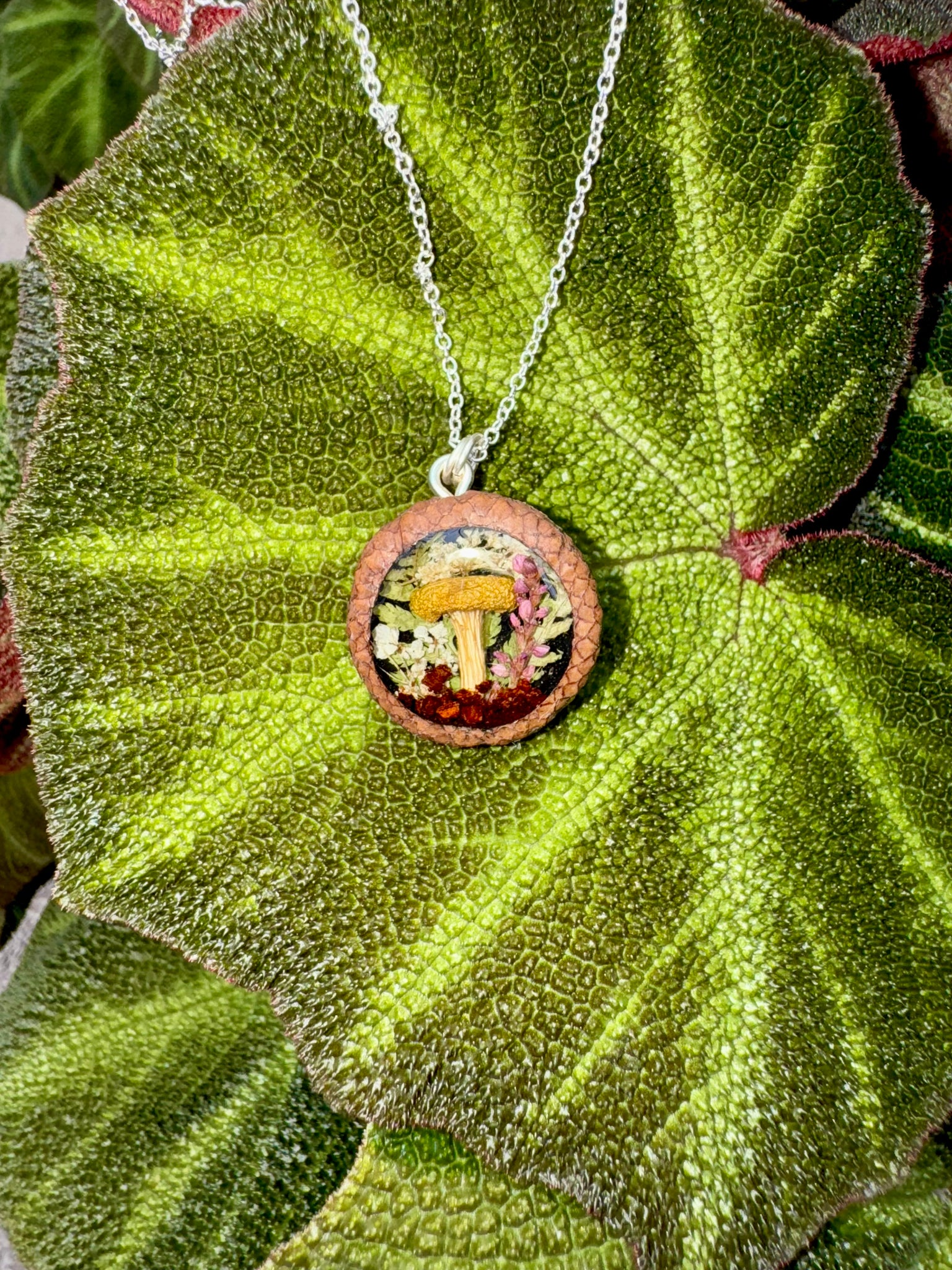 Roughly 1” acorn cap filled with ferns flowers and a golden oyster mushroom ~ 16” sterling chain